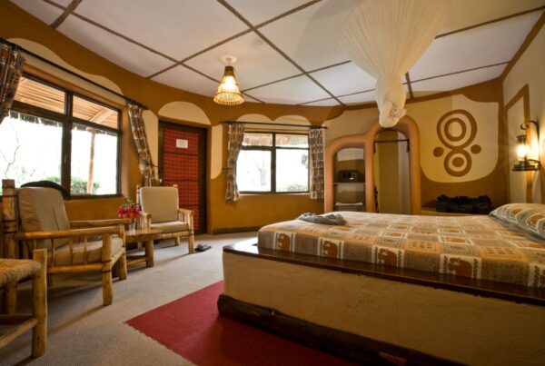 Amboseli Serena Safari Lodge is nestled within a grove of acacia trees, providing a uniquely privileged position with spectacular views of Mount Kilimanjaro and the surrounding savannah. The lodge's architecture is a graceful blend of Maasai-inspired design and modern comfort. Each of the 96 guest rooms is housed in a single-story building styled with traditional hand-painted murals and local artifacts. The central dining area, reached by an internal timbered bridge, and a palm-shaded swimming pool with a sundeck offer a perfect retreat after a day of game drives in this famous park.